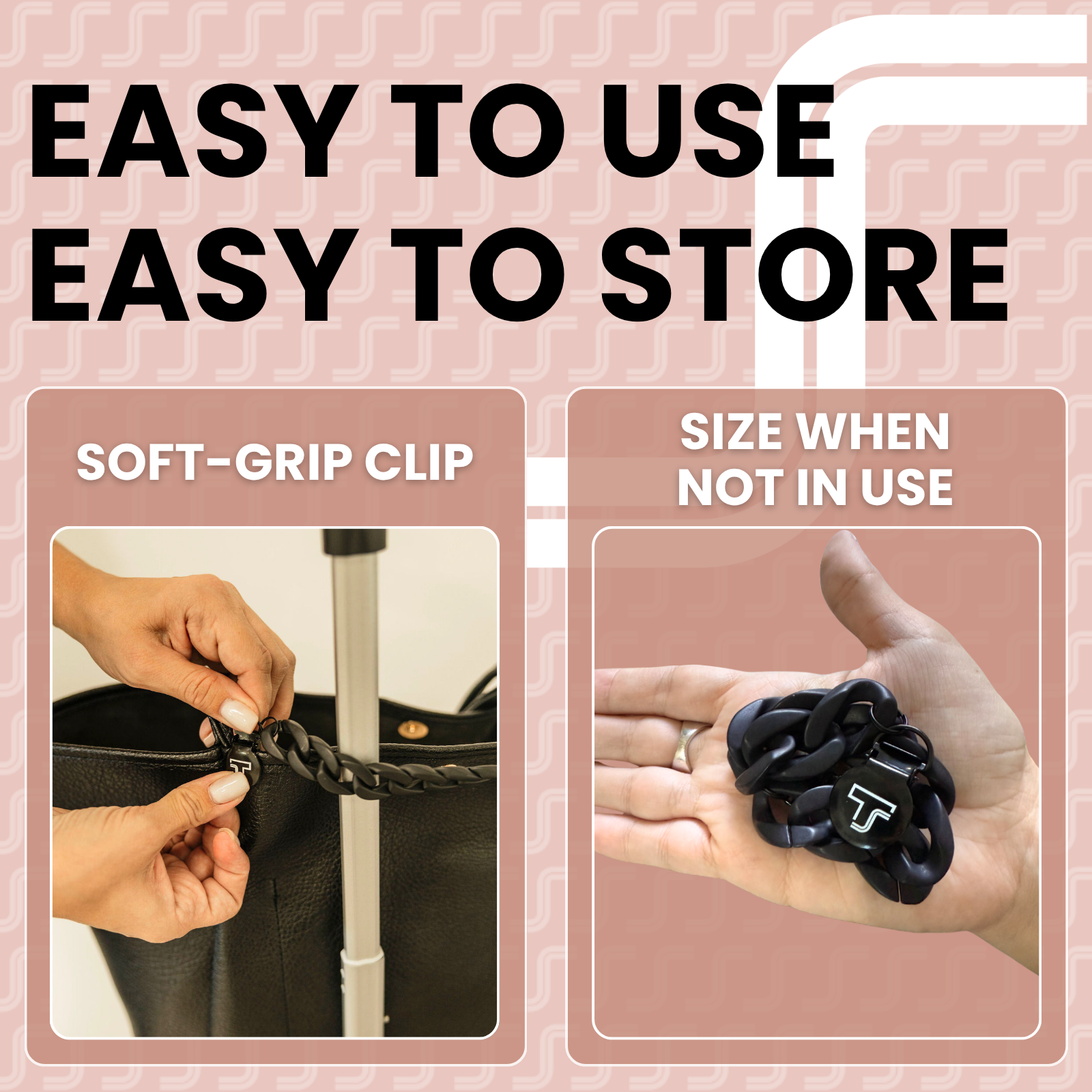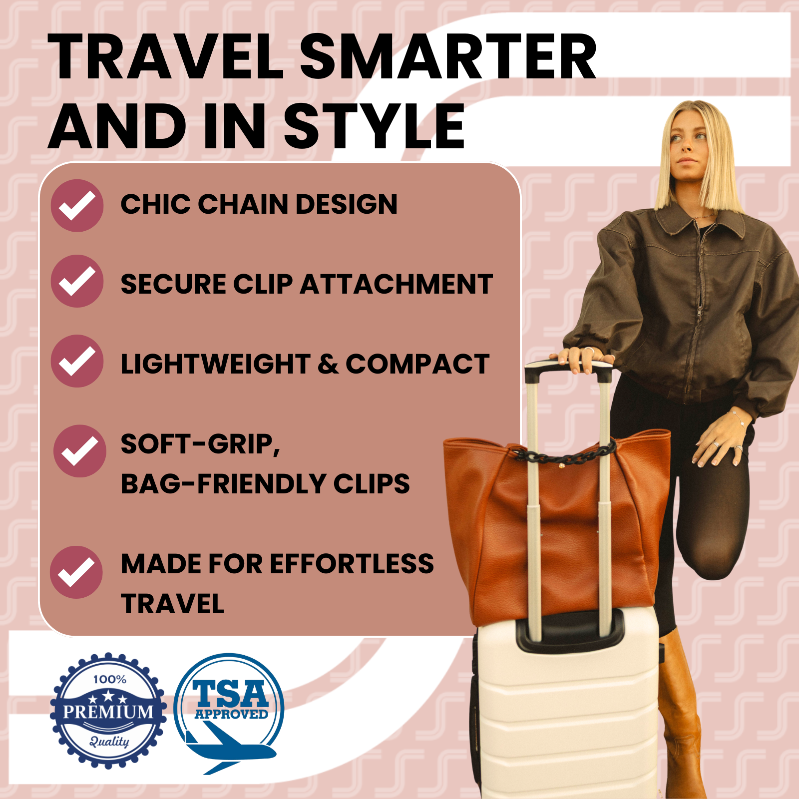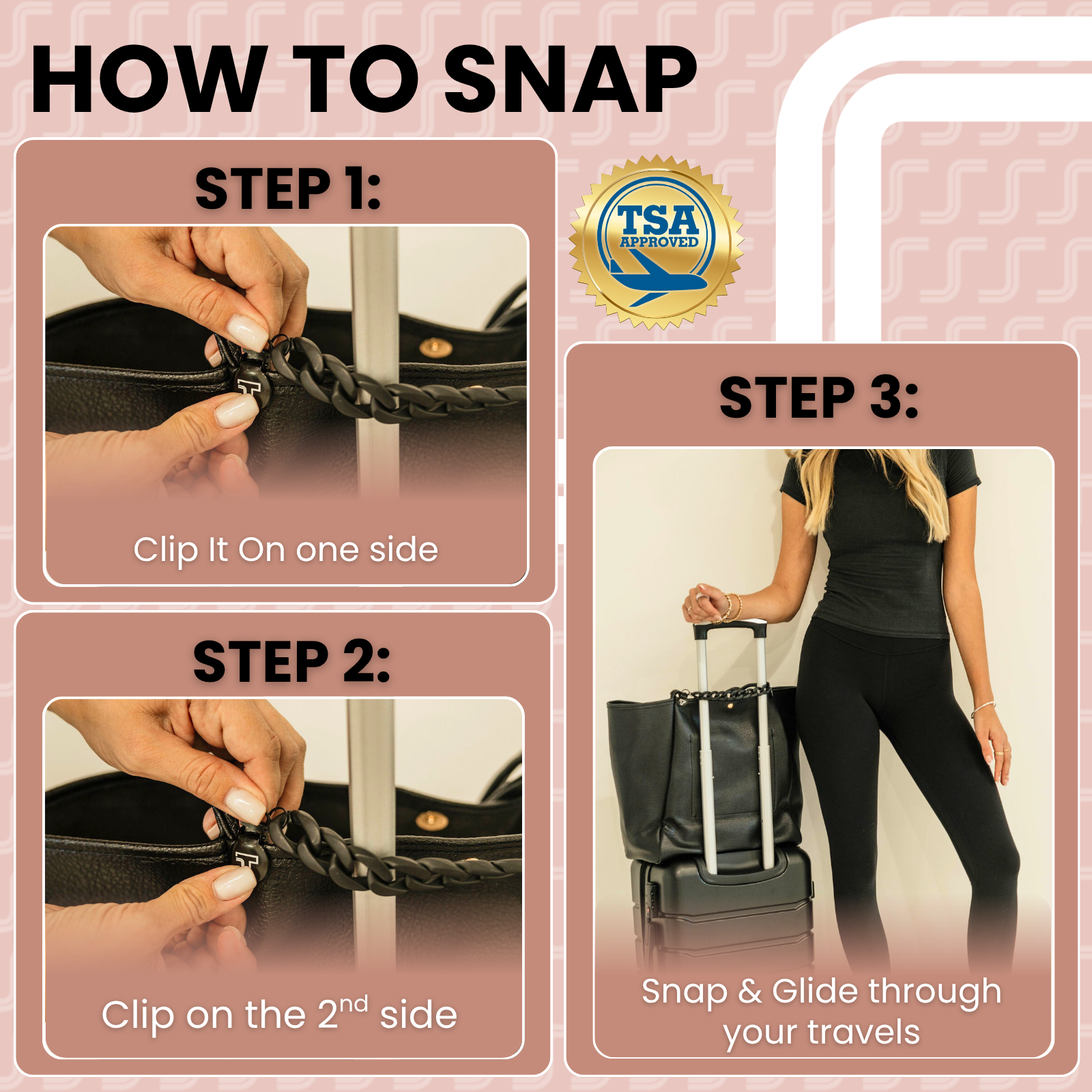 The Trolley Snap is an innovative airport travel accessory for attaching carryon bag to handle of rolling luggage. A versatile travel accessory for women, men, and families.  Trolley Snap is an acrylic chain attachment that instantly adds a pull-through sleeve to your purse, bag, or tote, even if it doesn’t have one. Effortlessly secure your bag while traveling by sliding it over any luggage handle, transforming it into a convenient carry-on.