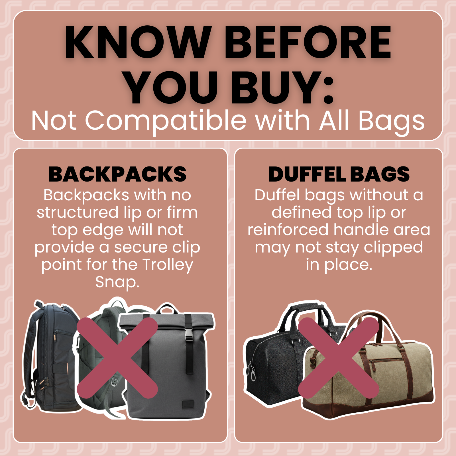 Whether it’s a business trip, weekend getaway, or family vacation, the Trolley Snap adapts to your travel needs. Use it with your favorite designer bag, briefcase, purse, or shopping tote and attach it to any suitcase Trolley handle. Stay organized, look chic, and travel with ease no matter the occasion.