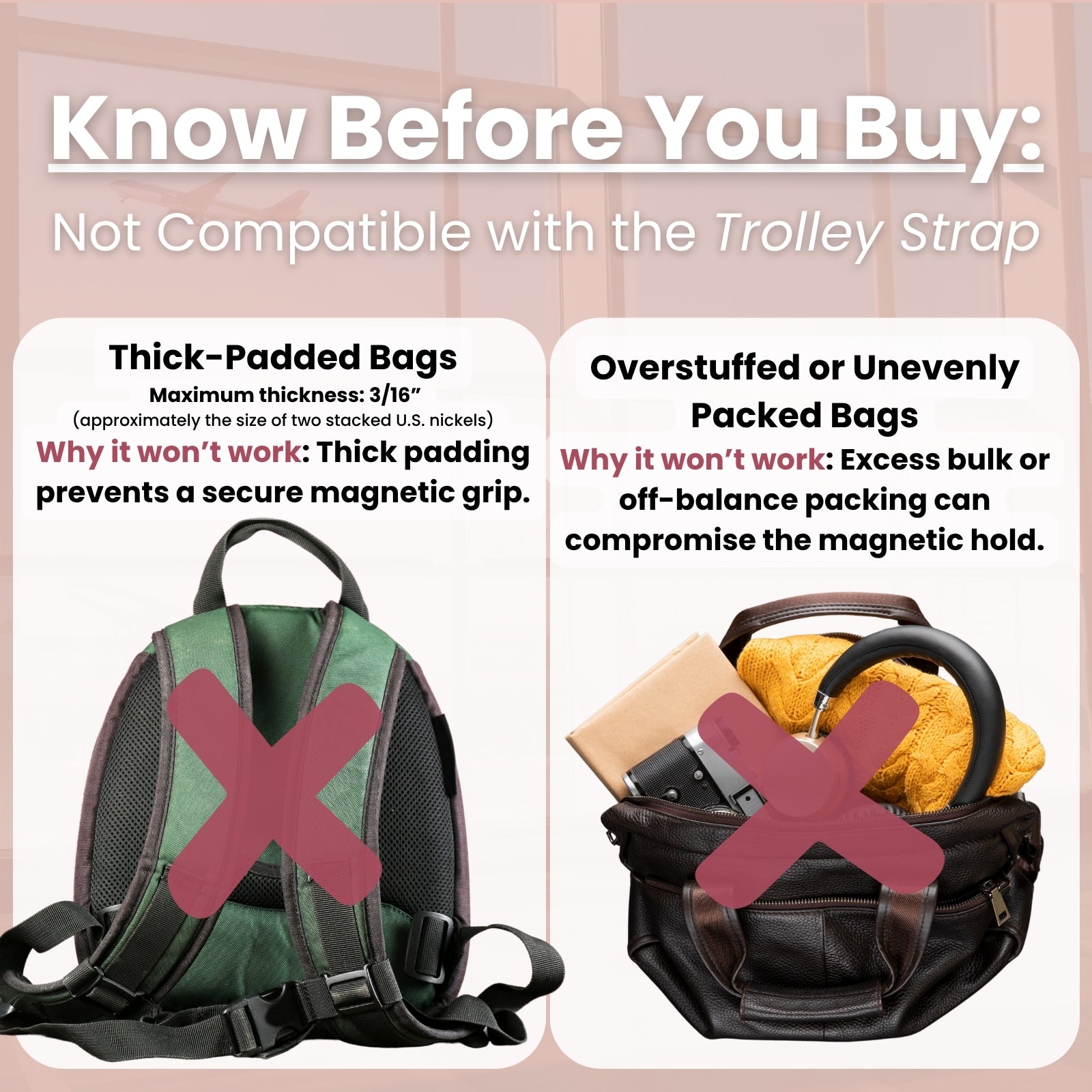 I recently received my Trolley Strap and am so excited to use it! Love the color (pink!) and am so excited to finally have something that lets me use any purse/tote when traveling.